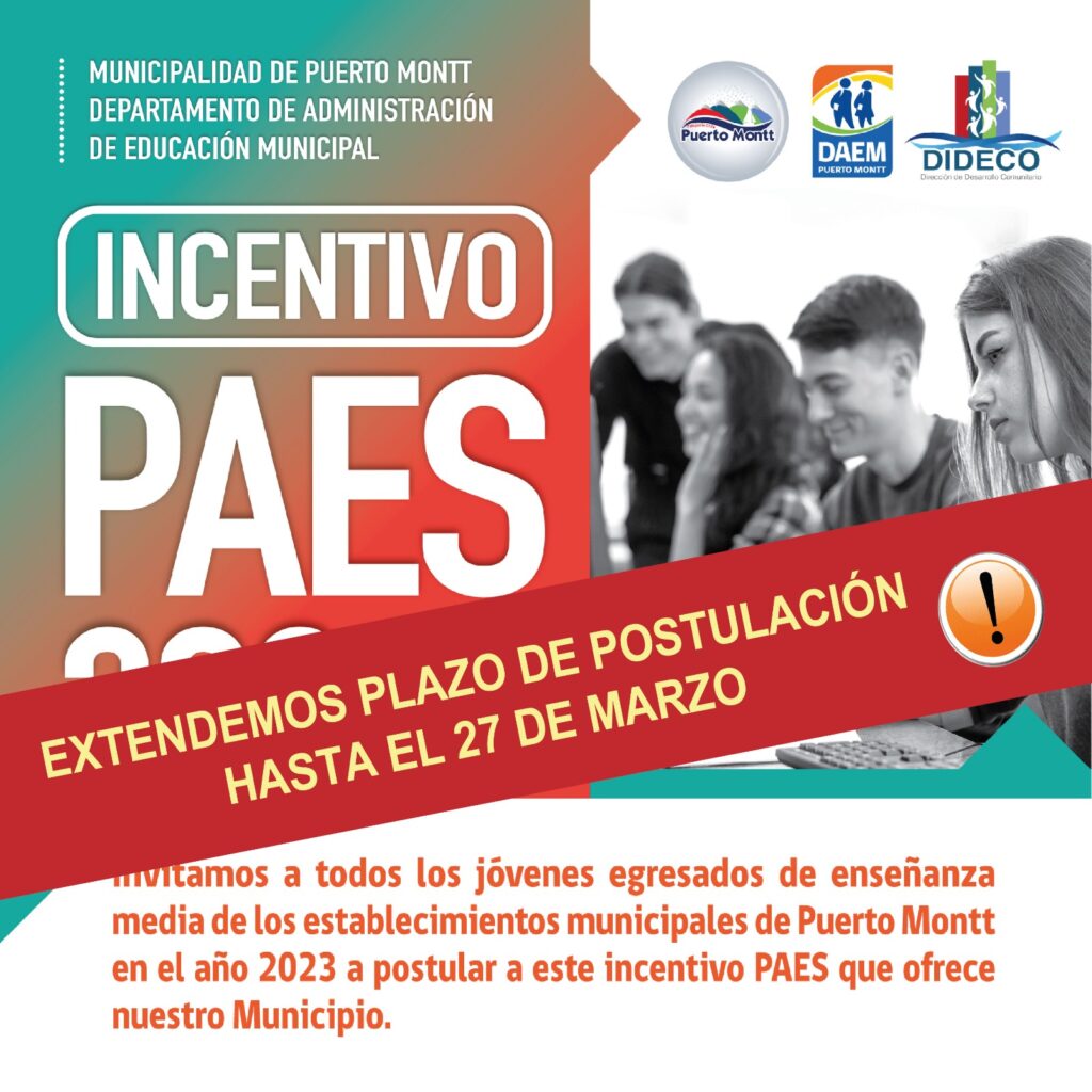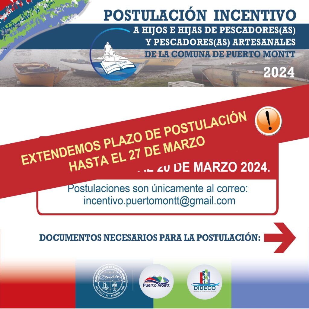 La Municipalidad de Puerto Montt informó que se amplió el plazo para postular a los beneficios para “Hijos e Hijas de la Pesca Artesanal” y el “Incentivo Prueba de Acceso a la Educación Superior (PAES)” que apoyarán el primer año de estudios superiores de egresados de la educación municipal de Puerto Montt.